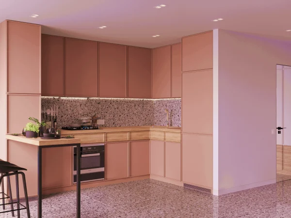 Яркий акцент проекта – цветовая палитра и пастельные элементы в кухне.